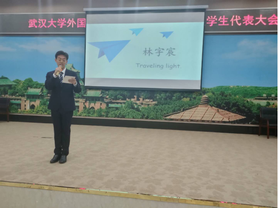 黄宏发老师向同学们致以亲切的问候,肯定了外院学生会在过去一年中取得的“优秀学风建设集体”“十大杰出志愿服务集体”“阳光体育先进集体”等成绩。黄老师指出,2020是极不平凡的一年,外院学生会坚守岗位,克服困难,鼓舞了全院师生抗击疫情的信心,并主持全校英语学习打卡活动,让学生们真切地感受到在家如在“珈”,切实把学生会打造成了保护学生合法权益、促进共同发展的重要平台。