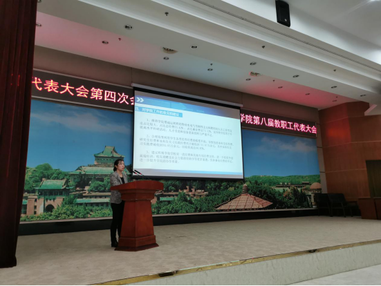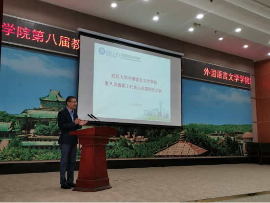 学院党委副书记、工会主席胡浩作教代会与工会工作报告,他回顾了2019-2020上半年的工作,分别从学院教代会组织建设、履职情况以及工会工作方面进行了总结。他还特别提到,在今年上半年的抗疫工作中,教代会代表和工会委员们发挥了重要作用。同时,胡浩书记对明年的教代会与工会工作进行了展望,他强调,学院将继续坚持“三级联动”、“三位一体”的工作模式,进一步加强学院教代会标准化建设,切实履行教代会职责。他还特别强调,今后外语学院教代会工作的重点在于进一步推动学院教代会代表们履职能力的提升,要强调、落实、告之代表们的知情权、参与权、表达权、监督权,使代表真正能“代表”,确保广大教职工表达正当利益和诉求的渠道畅通。