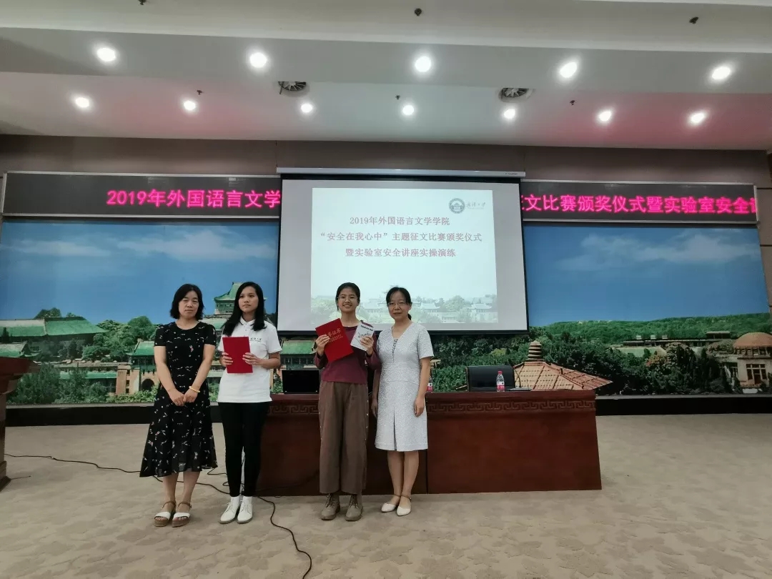 本次活动首先进行的是由外语学院电教实验中心举办的“安全在我心中”主题征文比赛颁奖仪式,获得本次征文比赛一等奖的同学为苏恒悦,获得二等奖的同学有黎乐昕、刘梅珊,获得三等奖的同学有钟雅贤、李玉希和赵晓轩。学院领导和老师分别为获奖同学颁发了荣誉证书和奖品。值得关注的是,本次安全征文活动获得了学院的大力支持,并给予了获奖选手十分丰厚的奖励,足见学院对学生安全工作的重视。奖品包括充电宝、蓝牙耳机和大容量硬盘。奖品自然可贵,但相信同学们在安全征文比赛中学习到的安全知识、培养起的安全意识更为珍贵,因为安全就是最好的礼物。